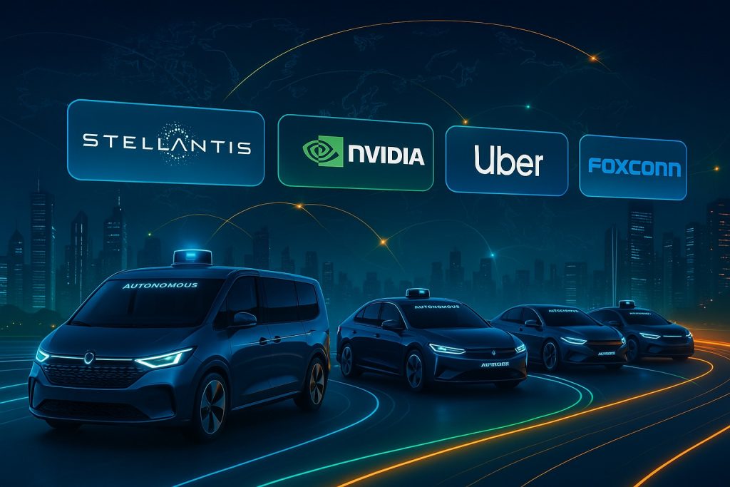 Stellantis announced Monday a major collaboration with Nvidia, Uber, and Foxconn to develop and deploy Level 4 autonomous vehicles for robotaxi services worldwide. The partnership represents one of the most ambitious autonomous vehicle initiatives to date, with Uber planning to scale its robotaxi network to 100,000 vehicles starting in 2027.